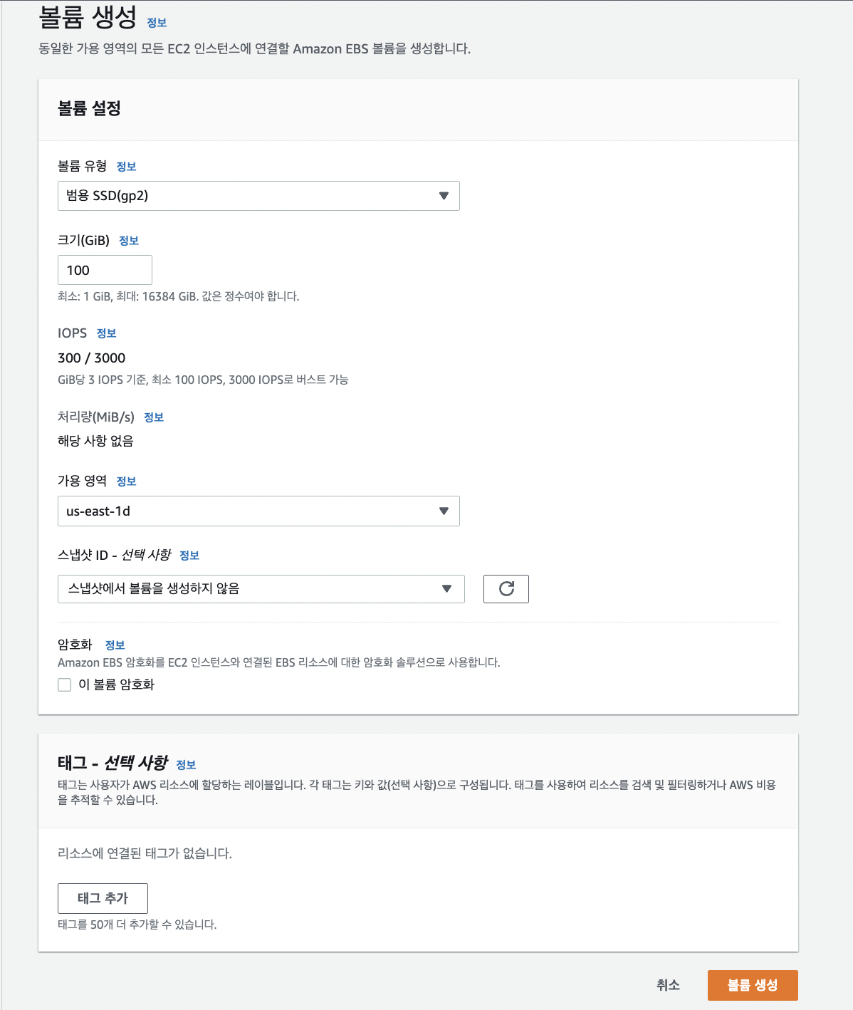 생성 버튼을 누르면 이러한 설정 페이지가 나옵니다. 이때 주의할 점은 볼륨을 생성할 가용 영역입니다. 볼륨을 생성한 후에는 동일한 가용 영역에 있는 인스턴스에만 볼륨을 연결할 수 있습니다. 따라서 파일을 공유할 인스턴스의 가용 영역을 확인한 후, 그 영역을 선택해야 합니다.(저 같은 경우 해당 작업을 수행할 인스턴스들의 가용 영역이 us-east-1d 이기 때문에 해당 가용 영역을 선택했습니다.)