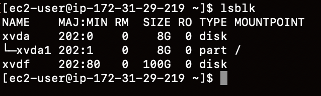 lsblk 명령어를 사용해서 해당 디바이스의 정보를 확인합니다. 명령어를 입력하면 위와 같은 실행창이 나오는데, 이를 통해 우리는 디바이스 이름이 /dev/xvdf로 설정되있음을 알 수 있습니다.