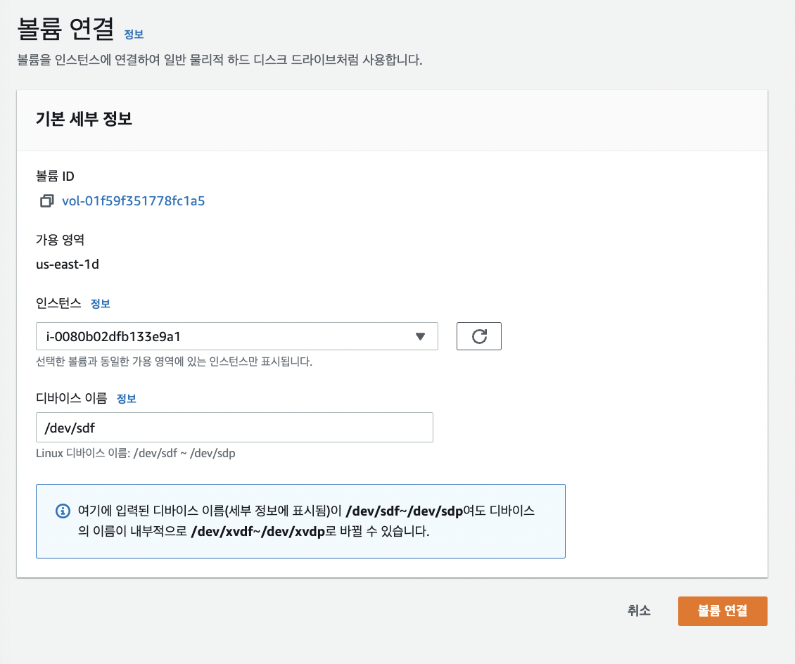 그럼 이러한 페이지가 나오는데 이때 제가 원하는 인스턴스를 선택한 후 볼륨 연결을 클릭합니다. 디바이스 이름 같은 경우 현재 /dev/sdf이지만 내부적으로 /dev/xvdf ~ /dev/xvdp로 바뀔 수 있습니다. 따라서 연결 후 인스턴스로 들어가 확인해주는 작업이 필요합니다.