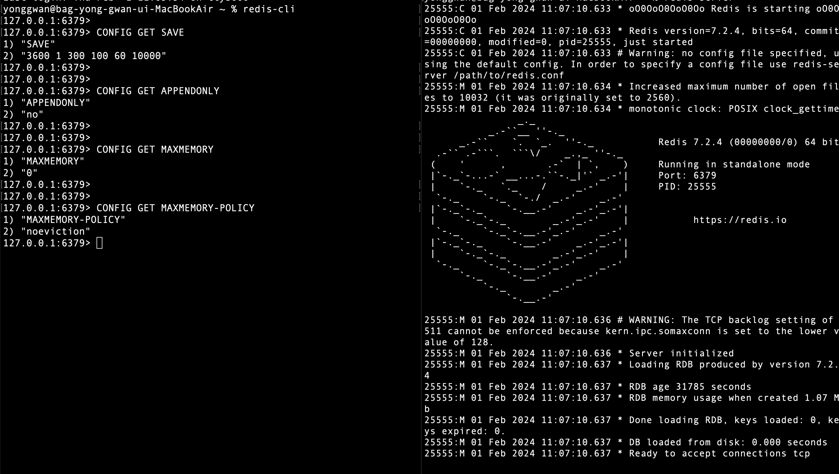 redis.conf 파일을 작성하고 redis 서버를 띄울때 해당 파일을 연결해서 서버를 띄우는 방법입니다. 보시는 바와 같이 redis.conf 파일에는 제가 원하는 설정 값을 입력하고 서버를 가동할때 설정값이 제가 원하는 값으로 설정된 것을 확인할 수 있습니다.