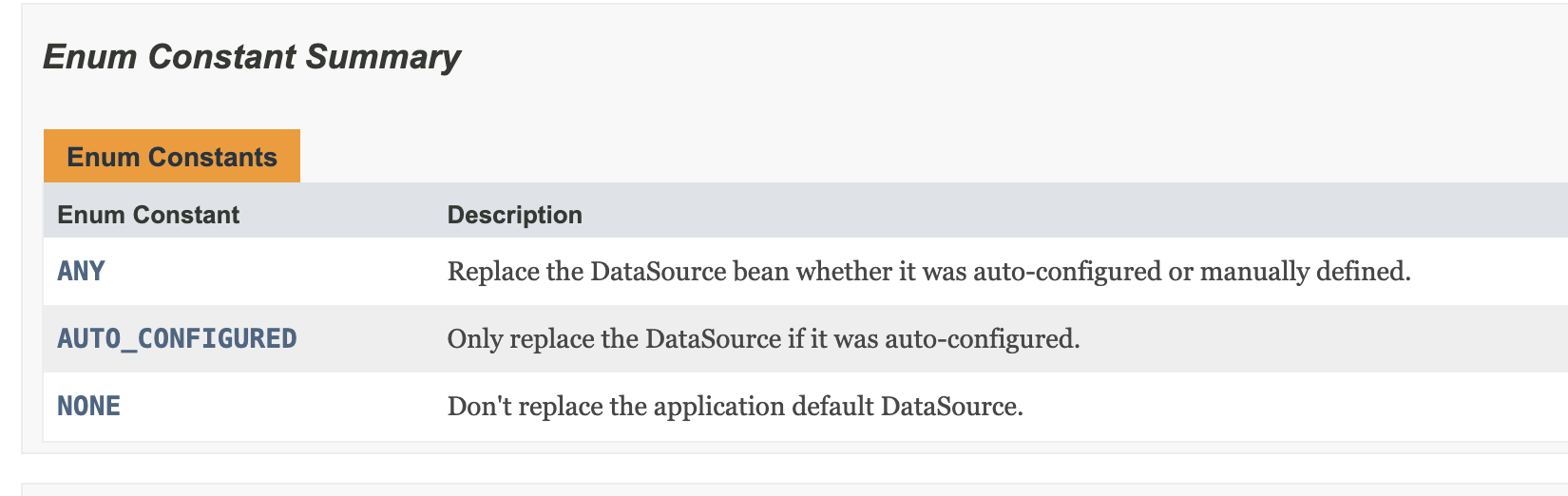- https://docs.spring.io/spring-boot/docs/current/api/org/springframework/boot/test/autoconfigure/jdbc/AutoConfigureTestDatabase.Replace.html#ANY