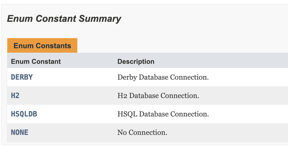 - https://docs.spring.io/spring-boot/docs/current/api/org/springframework/boot/jdbc/EmbeddedDatabaseConnection.html