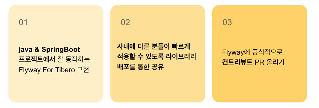 실제로 이전 flyway의 PR을 보니 저희가 사용하는 DB에 대한 지원 질문이 Issue로 올라와 있었고 직접 구현해야 된다는 답변을 받은 내용이 존재했습니다. 그래서 저희 팀은 이를 직접 구현해서 기여하자는 목표를 세웠습니다.