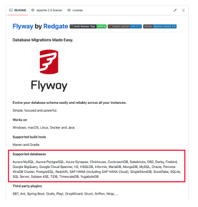 - 저희의 최종 목표는 결국 해당 코드의 오픈소스 기여인데, Flyway의 경우 오픈소스 기여에 관한 PR이 더 활발하게 이루어졌고 지원하지 않는 DB에 대한 지원 방법이 더 자세히 나와 있었습니다.