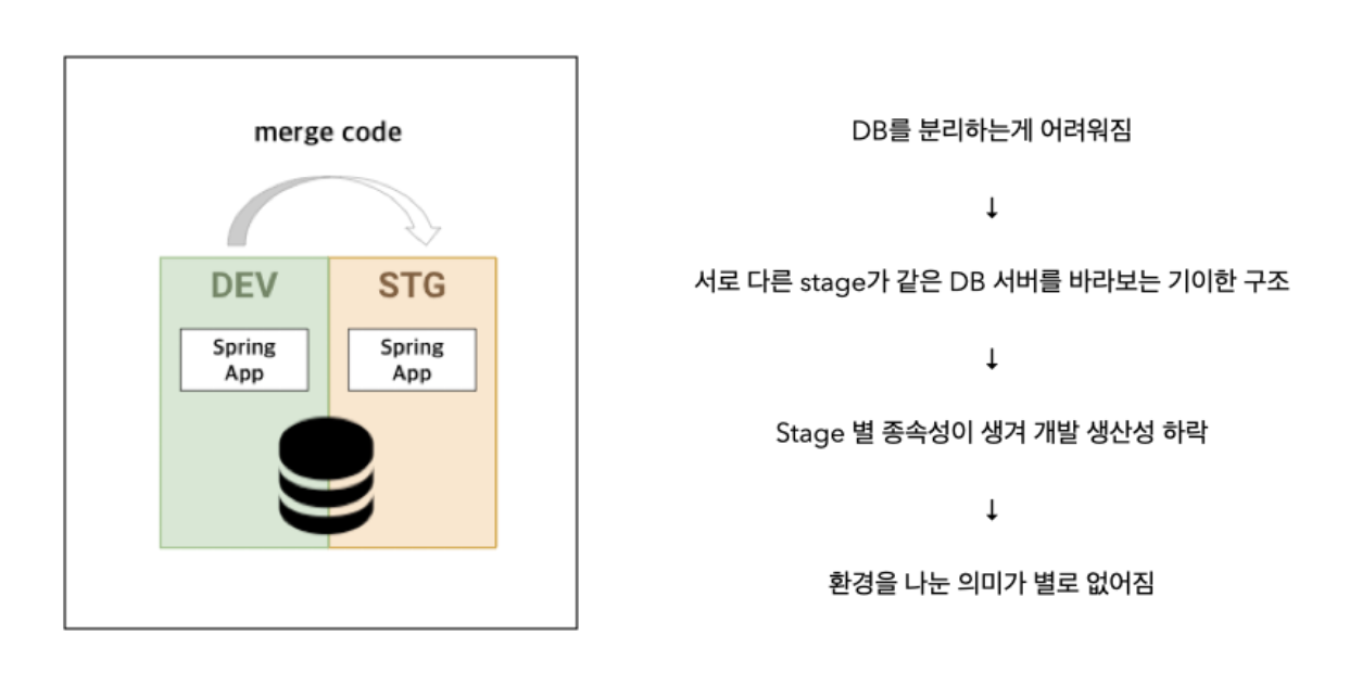 프로젝트 진행 시 개발 환경을 DEV, STG, PROD 환경으로 분리했습니다. 또한 ddl-auto 전략을 none으로 처리했습니다. 따라서 DB에 변경이 생기면 모든 환경에서 해당 변경 사항을 사람이 직접 DB에 반영해줘야 합니다. 사람이 직접 하다보니 중간에 변경 사항이 누락되면 큰 장애가 발생할 수 있고 환경 별로 매번 DB에 직접 반영해야되니 번거롭습니다. 또한 DB 변경 같이 민감한 작업에 대한 권한 설정을 하기가 어려워 보안에 취약했습니다.