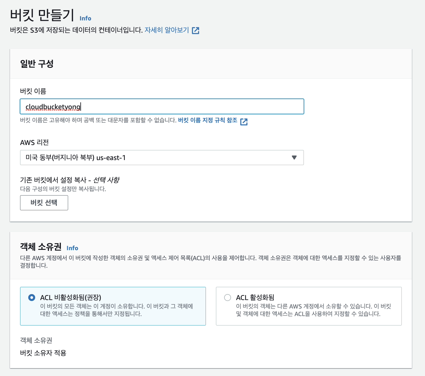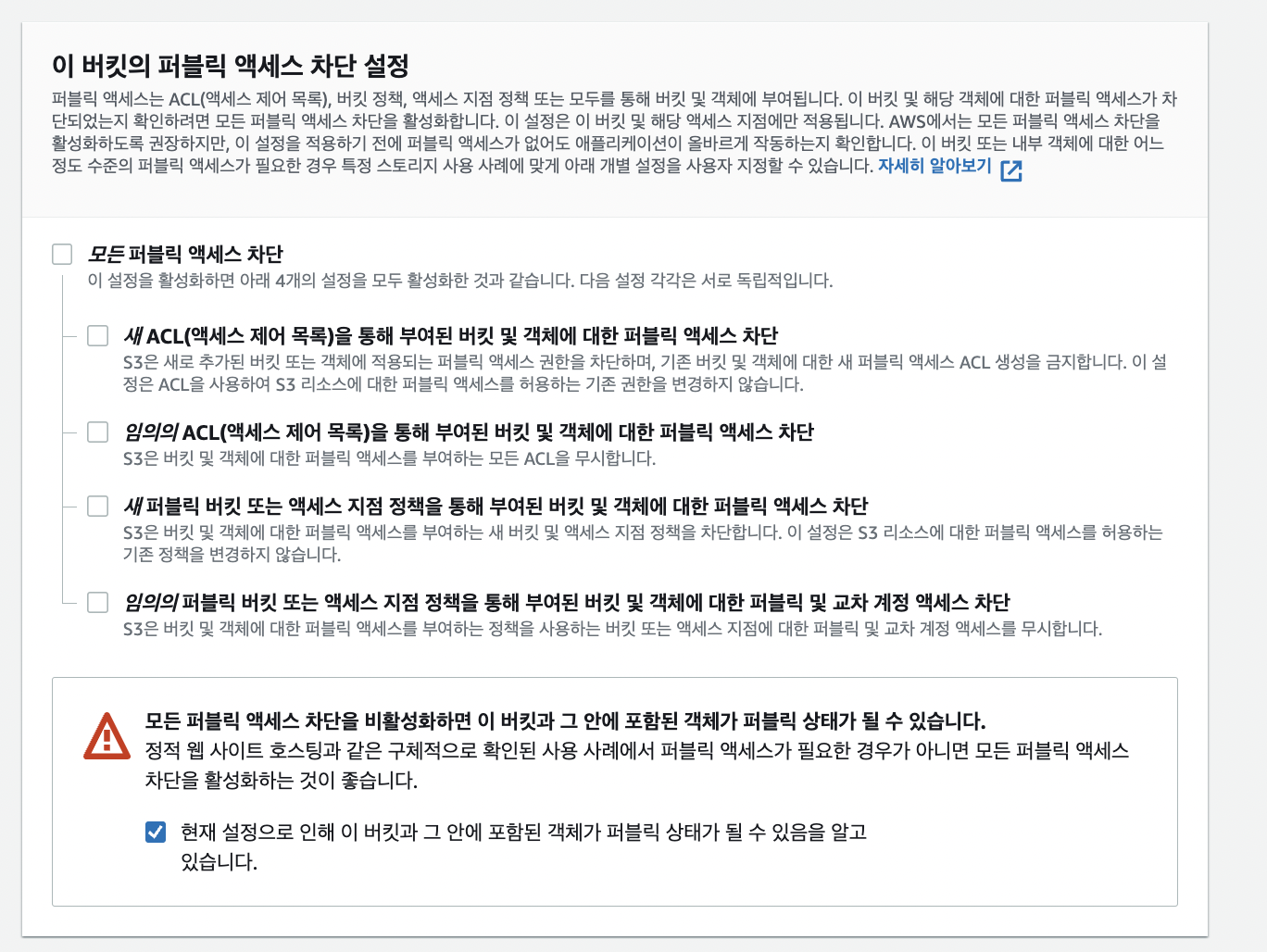 버킷의 이름은 고유해야하고 저 같은 경우 모든 퍼블릭 엑세스를 차단을 해제하고 아래만 체크를 하였습니다. 이것 같은 경우 S3를 어떤 식으로 사용할 것인지에 따라 달라집니다.