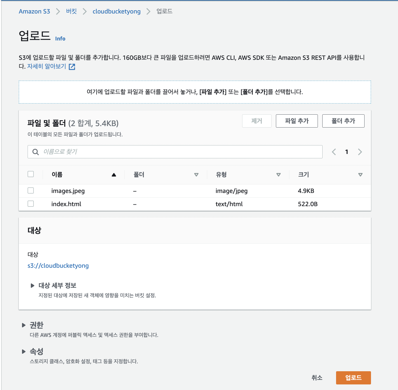 해당 버킷을 생성하면, 일정 시간이 지난 후에 버킷이 생성되고 이 버킷에 파일을 업로드할 수 있습니다. 저는 정적인 페이지와 기본 스크린 페이지를 업로드해야 하므로 위의 사진에서 업로드 버튼을 클릭한 후, 제가 만든 정적인 페이지와 이미지를 업로드하였습니다. 업로드 버튼을 클릭하면 아래와 같은 페이지가 뜨고 이 페이지에서 파일 추가 버튼을 통해 제가 원하는 것을 버킷에 업로드합니다.